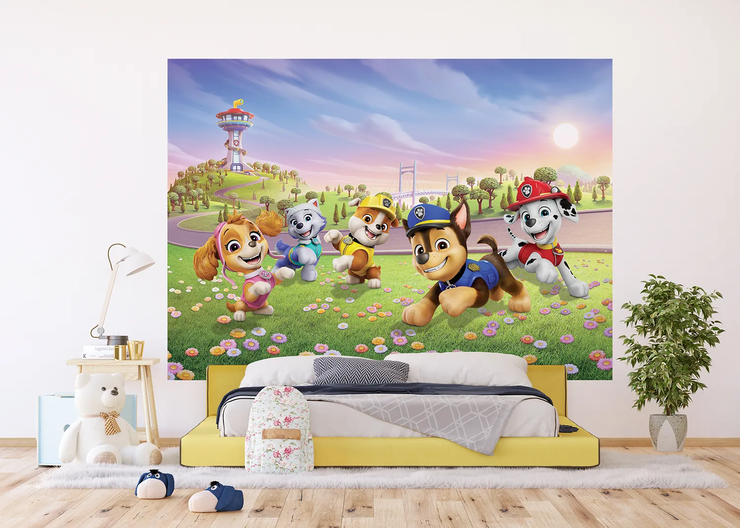 Fototapeta na zed‘ Tlapková patrola Štěňata na květinovém poli | 252 x 182 cm | FTDXL 2063