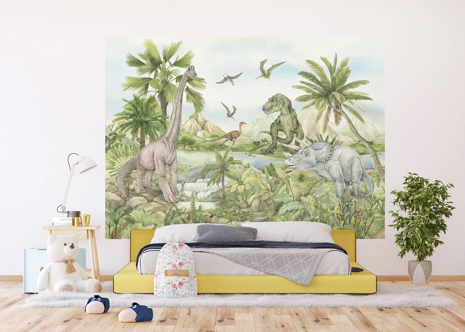 Step into prehistoric adventure right in your child’s room with our delightful Dino wall mural! Designed to infuse warmth and joy into their space, these photomurals bring a playful touch to any kid’s haven. Bring your little explorer into a land of ancient wonders and colossal creatures, igniting their imagination and love for different dinosaurs!